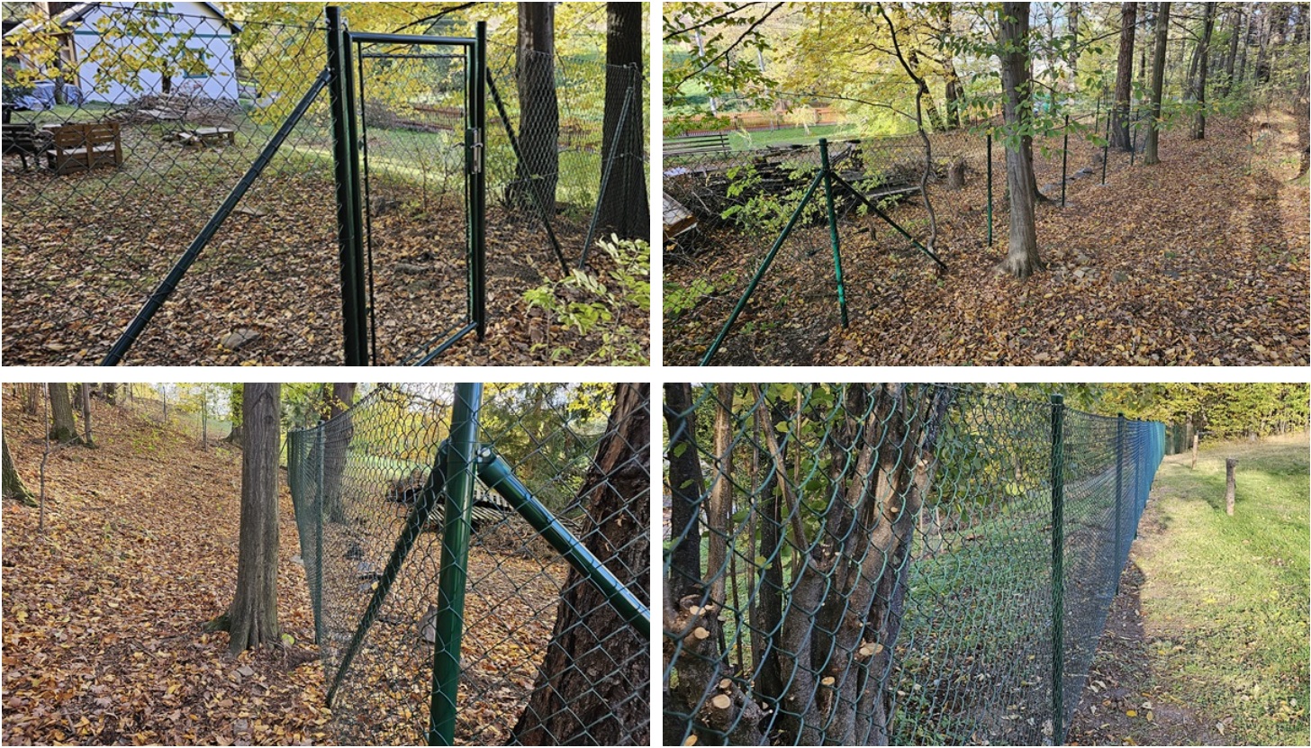 Montáž oplocení v lesním porostu.